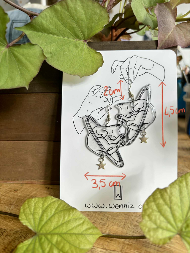 Boucles d’oreilles illustrées à la main en noir sur du plastique rétracté. Résine crystal anti U.V.