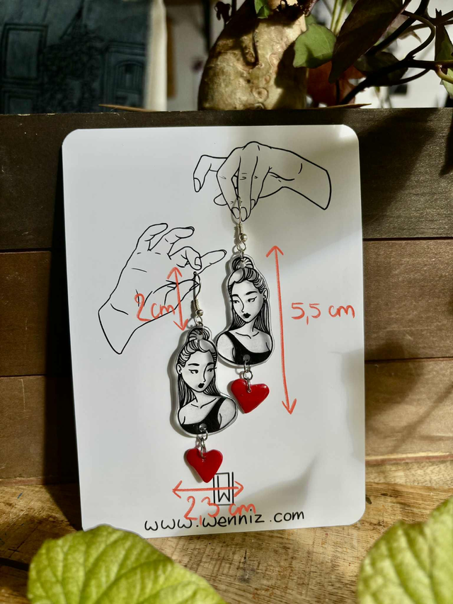 Boucles d’oreilles illustrées à la main en noir sur du plastique rétracté. Résine Crystal anti U.V.