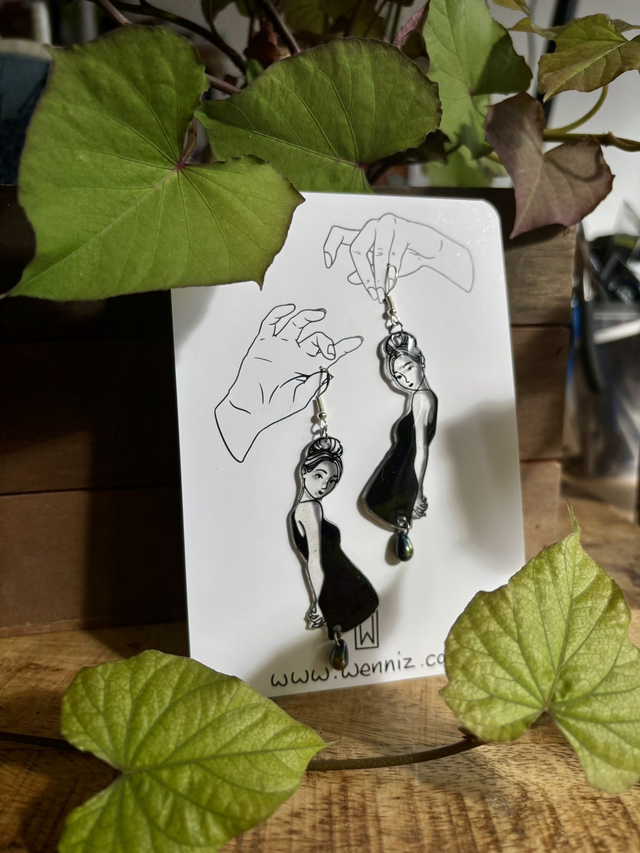 Boucles d’oreilles illustrées à la main en noir sur du plastique rétracté. Résine.